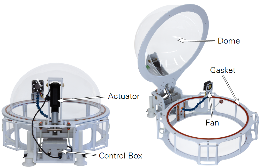 Each Automated Canopy Chamber includes either a 10 cm or 20 cm tall soil collar and possibly one or more base extensions listed in Table 1‑2. Chambers are available with a transparent or opaque white dome.