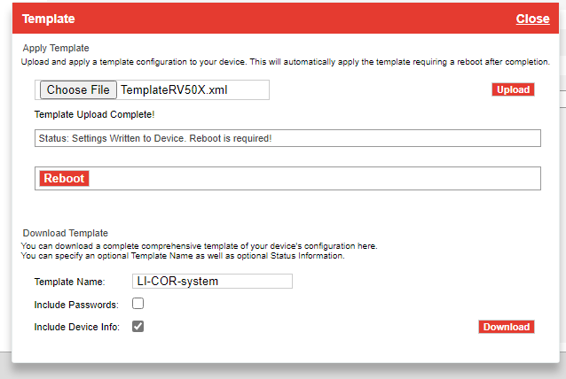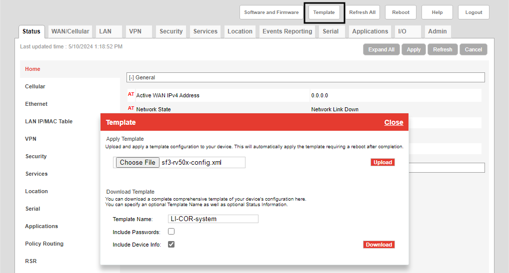 If you've gone through the steps to create your own configuration, you can save it for safekeeping, future reference, or to deploy to other RV50X gateways. To save it, click Template, and then choose Download.
