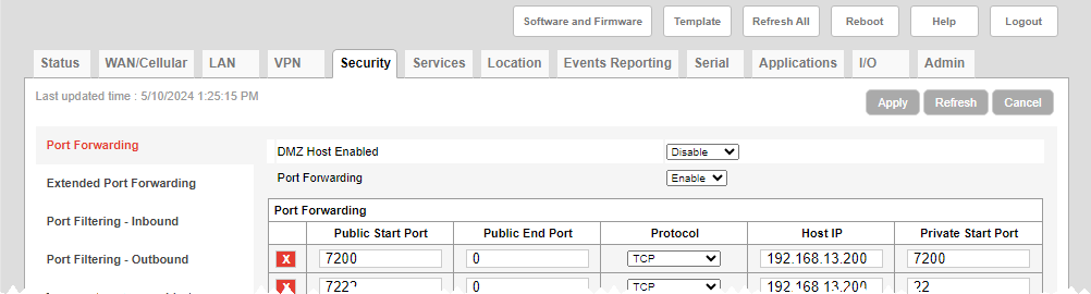 In ACEmanager™, under Security > Port Forwarding, click Add More and enter the relevant information from Table 3‑1.