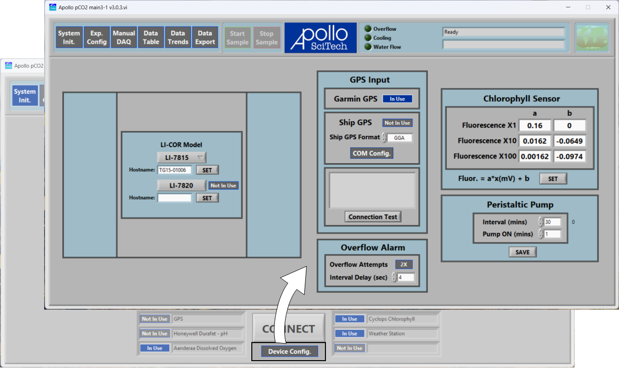 Click Device Config. for the settings of CO2 analyzer model, GPS input, overflow alarm criteria, user-calibrations of the chlorophyll sensor, and the time and frequency of the peristaltic pump.