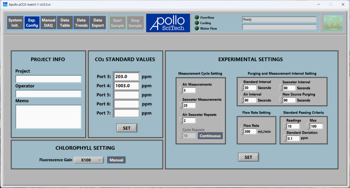 Exp. Config presents options for a measurement, including details about the project (PROJECT INFO), gas standards, chlorophyll gain setting and the timing and sequence. The timing and sequence is described in The measurement sequence. Operating information is in Measuring pCO2 in water.