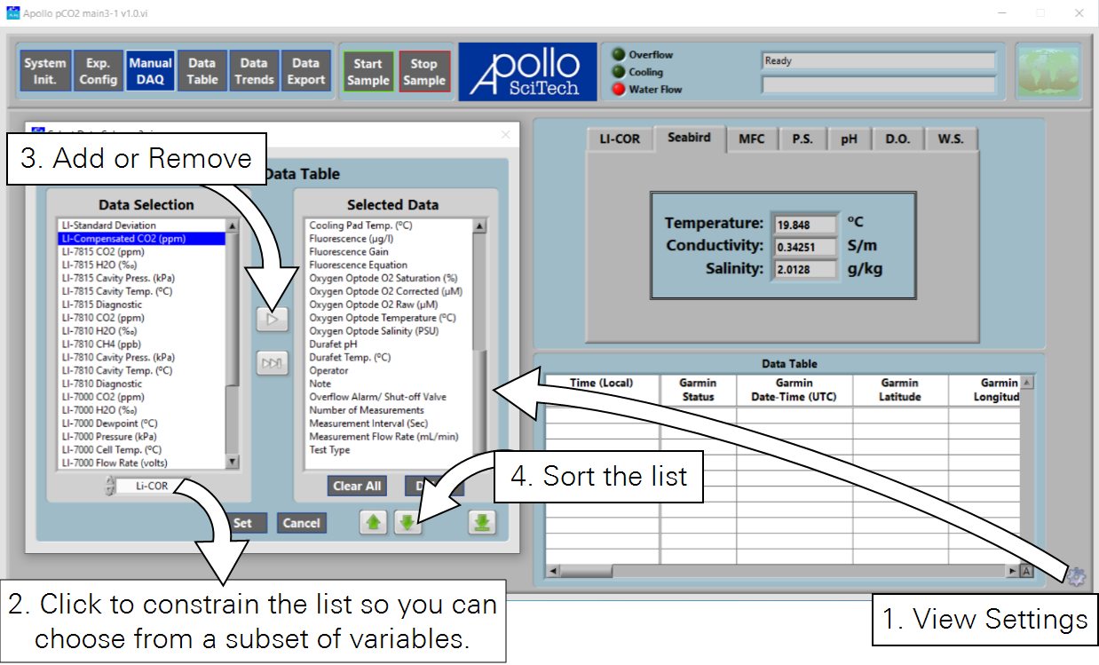 If you click Start Manual DAQ, results are displayed in the table to the right. You can customize the table — click the Settings button at the lower right to select data to display, view a subset of variables from the list, add or remove variables, and sort the list.