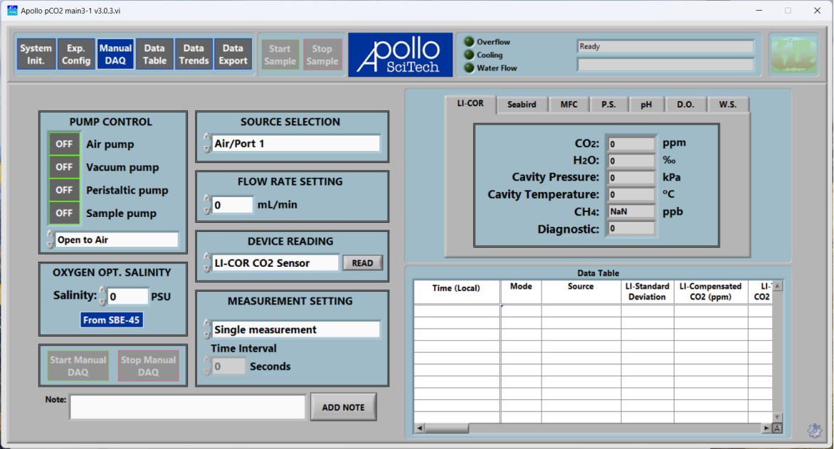The portion of the interface under Manual DAQ is to manually control pumps, gas sources, and other parameters of the system. This tab is useful for troubleshooting or testing that components respond as expected. You can manually control the system and collect data using these controls, but this is only recommended if, for some reason, the automatic procedure is not available. In this section, we describe the controls in the Manual DAQ page.