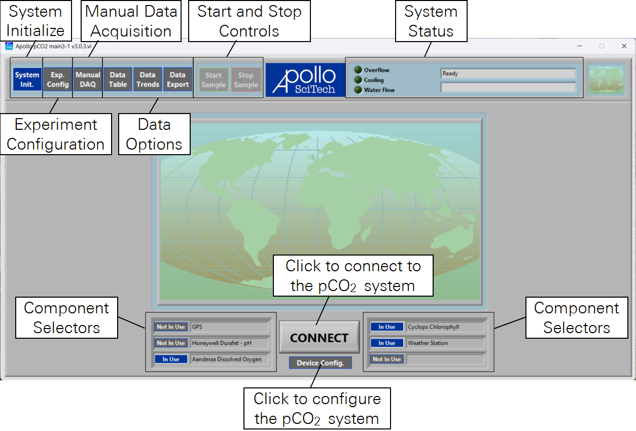 The pCO2 application opens to a System Initialization screen, which presents options to connect to devices, configure measurements, view data, and view the system status.
