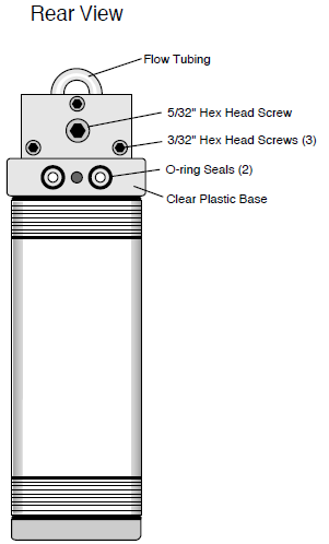 - Use a 3/32" hex key to remove the three screws on the front and rear of the assembly, and two of the four screws on the top. Leave the top two screws nearest the side with the flow adjust cap nut (opposite the side where the flow adjust knob was removed).