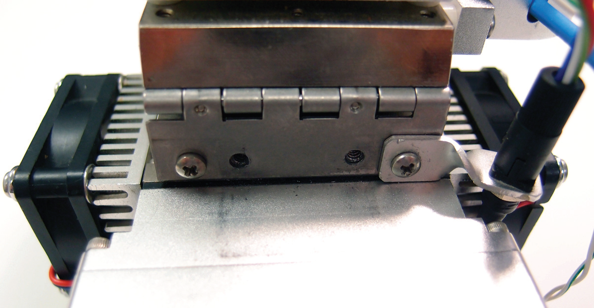 - Place the upper chamber manifold and hinge back on the lower sensor manifold. Install the two outer screws in the hinge, but do not tighten. This will allow for slight adjustments to ensure the other screws fit in Step 11. Be sure to install the correct screw through the bracket holding the round, black connector for the light source power (it’s slightly longer than the other one).