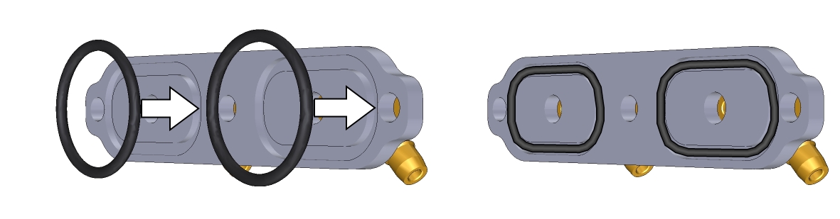- Install the manifold onto the head using the two long and one short screw removed earlier. Be sure that the O-rings are in place. Tighten the screws snugly.
