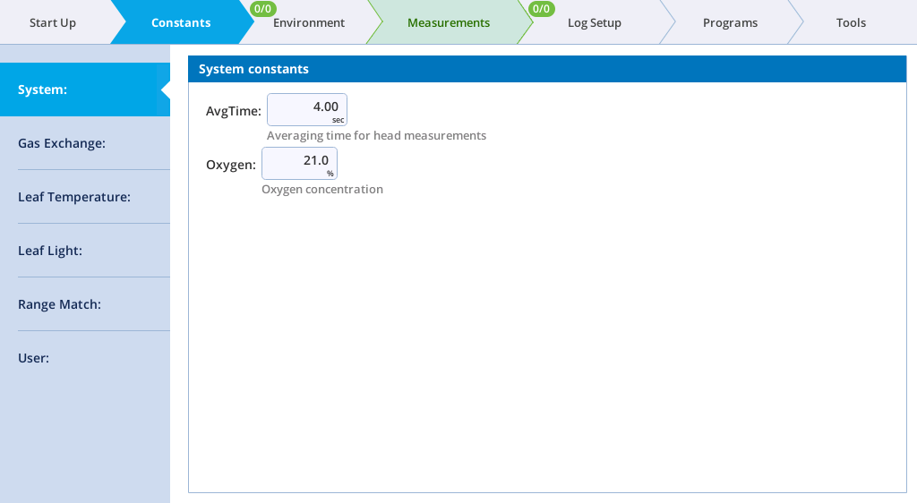 System constants present two user-settable values: Averaging time for measurements in the head (AvgTime) and Oxygen concentration. Typically, you'll use 4 second averaging and 21% oxygen for measurements in ambient air. You should change this value if you are using a low-oxygen tank (such as 0.5% or 2%).