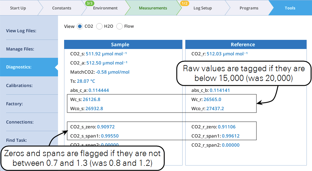 Criteria for flagging warnings in the CO2 and H2O IRGA diagnostics pages have been loosened.
