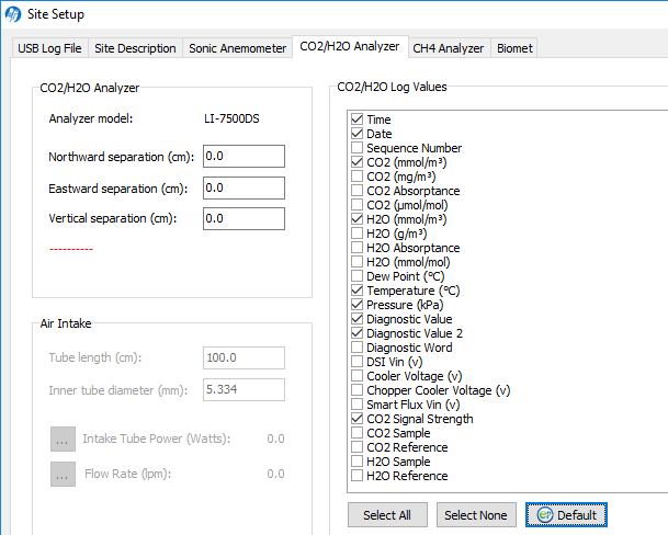 Under CO2/H2O Analyzer, enter the gas analyzer position relative to the sonic anemometer and select the values to log.