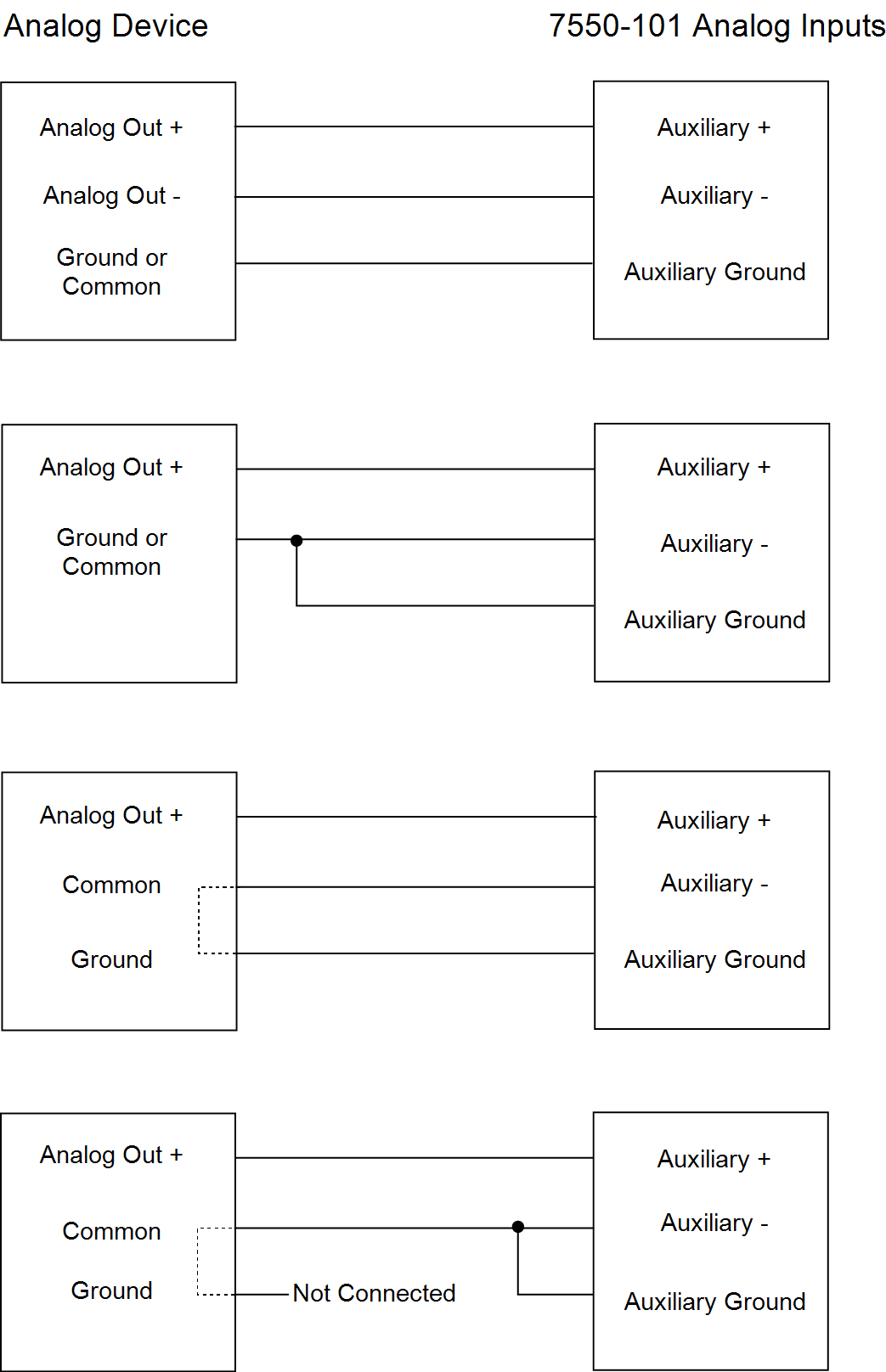All analog devices connected to the 7550-101 Auxiliary Sensor Interface must be referenced to the ground (GND) connection when connected to the LI-7550 analog inputs. Some examples are shown below.