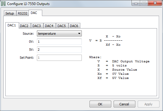 The LI-7550 has the capacity to output up to six variables on Digital-to-Analog Converter (DAC) channels 1-6. Click Configure LI-7550 Outputs to access the outputs dialog. The DAC tab allows you to configure the DAC output channels by specifying the source that drives the analog signal (CH4 mmol m‑3, CH4 µmol mol-1, temperature, pressure, signal strength, and set point), the measured value that corresponds to 0V, and the measured value that corresponds to 5V.