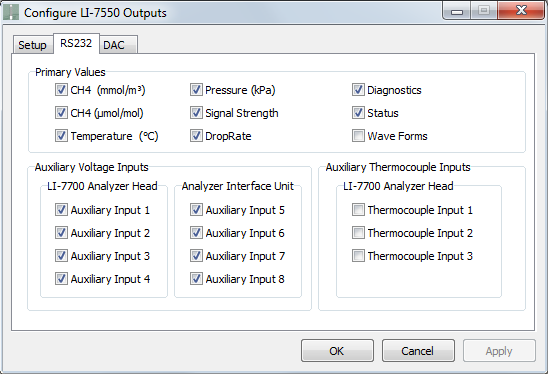 Click Configure LI-7550 Outputs to access the outputs window. The RS-232 tab is used to set the LI-7700 RS-232 port configuration for serial data output. After selecting the desired variables click Apply; the LI-7700 will begin to send data out the RS-232 port according to these parameters.