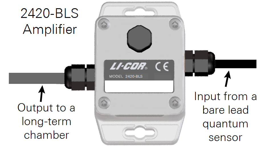 Important Note: The 2420-BLS amplifier is compatible only with 8100-104/C long-term chambers operating in multiplex mode (connected to the LI-8150 multiplexer). If a single chamber is connected directly to the Analyzer Control Unit, use the 2420-BL Light Sensor Amplifier and connect it to the Auxiliary Sensor Interface on the side of the Analyzer Control Unit.