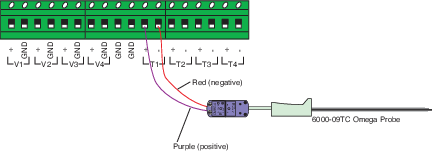 The 6000-09TC Omega soil temperature probe terminates with two bare wires for connection to the auxiliary sensor interface. Thermocouple channels 1-4 (T1-T4) can be used with the Omega soil temperature probe.