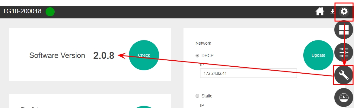 Next, you should check your LI-7810 software to make sure you are running version 2.0.8 or higher. Launch the LI-7810 web interface, click the cog icon , and then the Network icon. Your Software Version will be displayed in the upper-left of the page.