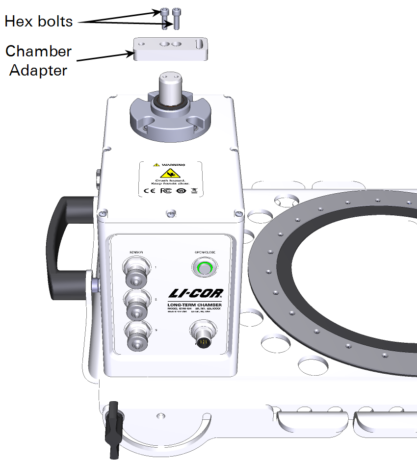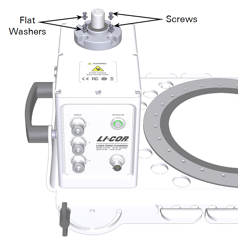 Around the opening of the chamber base is a black neoprene collar gasket that seals around a soil collar. This gasket should not need to be replaced unless it has become cracked, brittle, or otherwise damaged. Two spare collar gaskets (part number 6581-060) are included in the replacement gasket kit (part number 8100-612) and additional gaskets can be ordered from LI-COR.