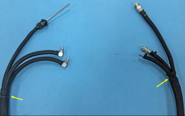 Cut the two cable ties holding the thermistor cable to the two air tubes and remove the old thermistor cable from the large braided wrap, freeing it from the two air tubes.