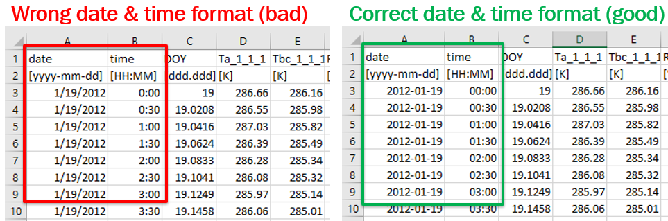 - The first three columns of the biomet file need to be ‘date’, ‘time’ and ‘DOY’ and it is important that these each need to be in the correct format. See the image below.