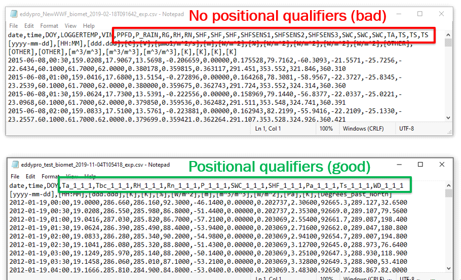 - This follows the new FLUXNET (ICOS/AmeriFlux) standards for variable naming for submission to their networks. EddyPro automatically appends them on the biomet outputs if they are not originally included. So, for your independent biomet variables, you will want to have the variable labeled, for example, as: TA_1_1_1, TA_2_1_1, NETRAD_2_1_1, etc. (Without the positional qualifiers, Tovi cannot differentiate TA from the Analyzer with TA from the biomet system.) You can make these edits in a program like Notepad (see below).
