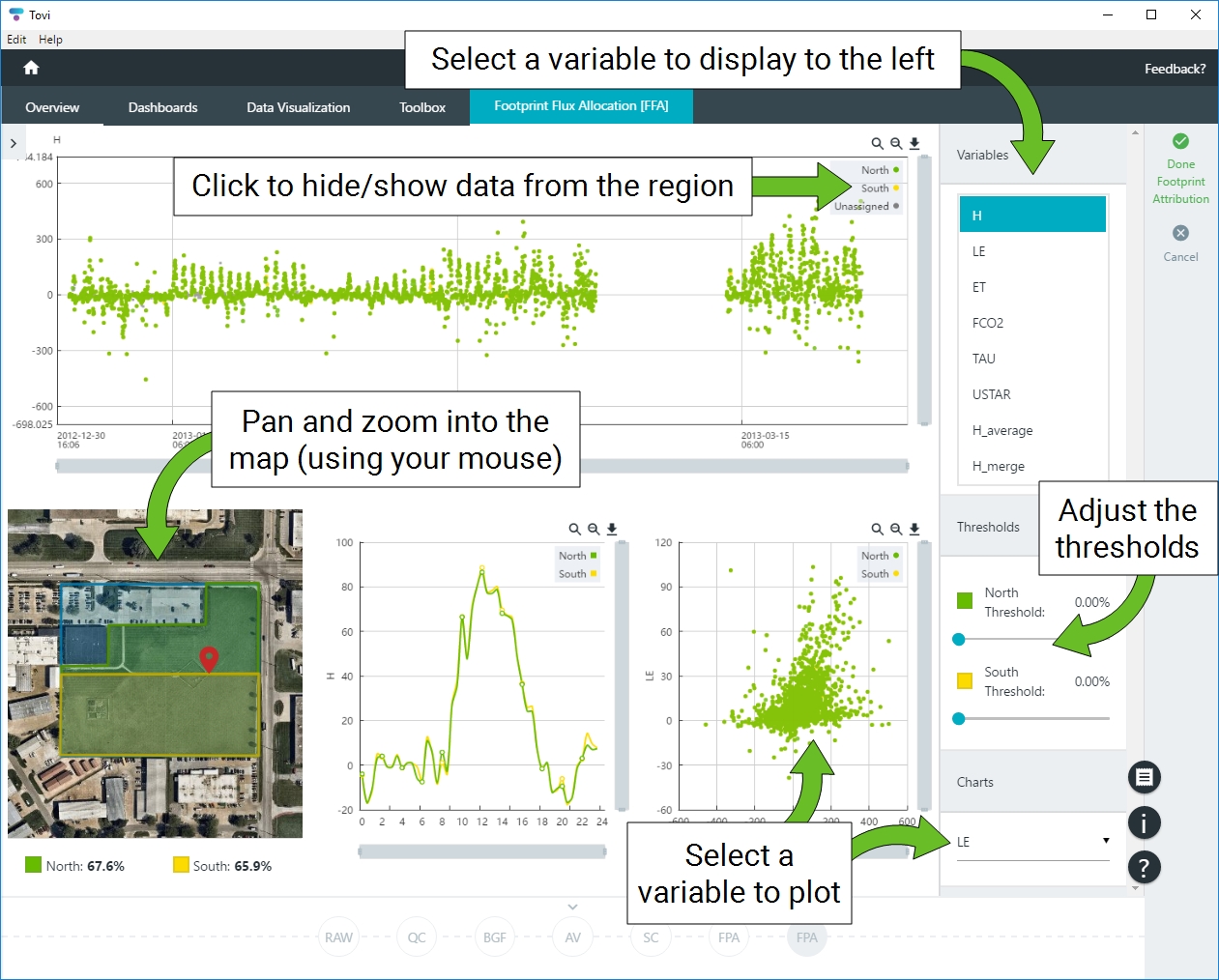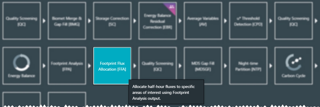 The Footprint Allocation tool is used to attribute the fluxes to one of two separate classes that you created in the Footprint Analysis tool (the Footprint Analysis tool must be run before the Footprint Allocation tool can be used, and you must select either the Footprint Analysis or a subsequent node to use the Footprint Attribution tool).