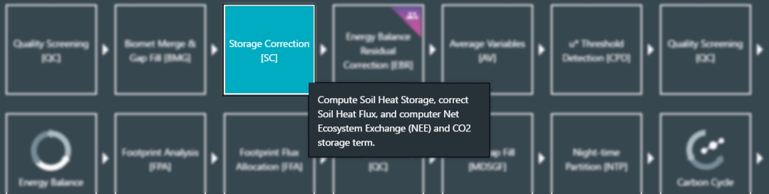 - Tovi will save the step and add a node to the processing sequence. The new node includes new computed variables, which you can view. You'll use the soil heat flux storage term to compute the energy balance and the CO2 storage correction in the u* threshold detection.