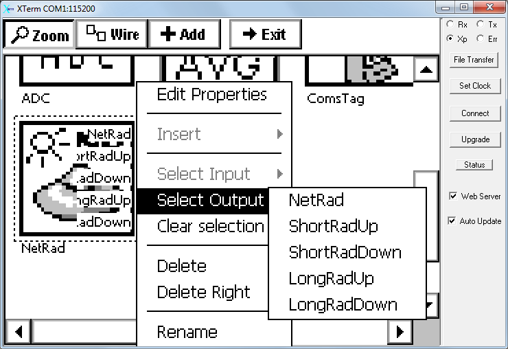 In this example, we added a NetRad block and selected CNR4 under Edit Properties. It has 5 outputs: NetRad, ShortRadUp, ShortRadDown, LongRadUp, and LongRadDown.
