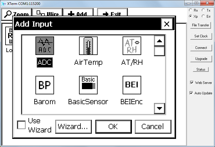 These steps show how to add a sensor using the ADC (analog-to-digital) block. However, many sensors are supported by pre-programmed blocks, which are configured similarly simply by selecting a sensor block rather than the ADC block. For a partial list of supported sensors, see Overview of Supported Sensors.