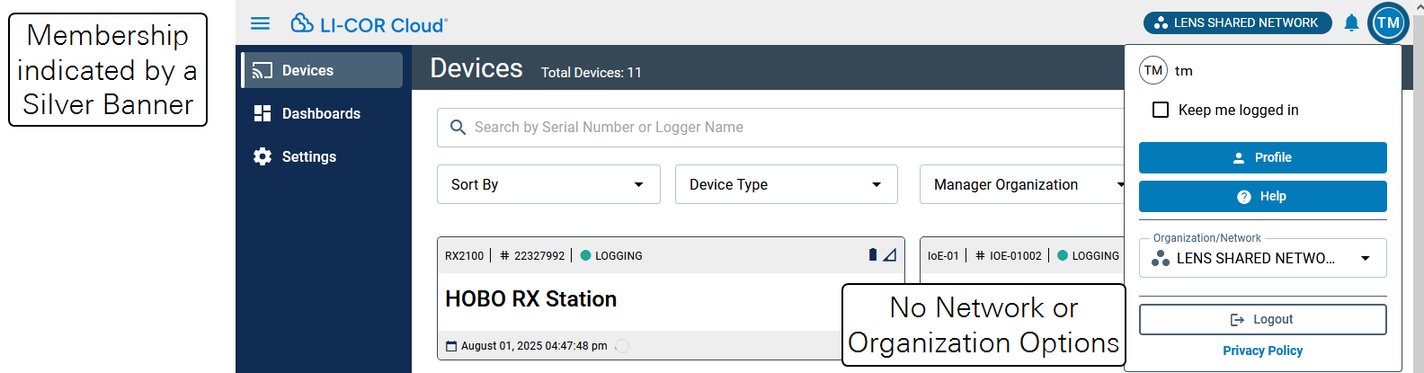 Select a different Organization/Network from the menu to change the organization that is loaded. This is available only if you belong to more than one organization.