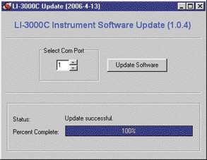 The LI-3000C internal instrument software is programmed into the instrument’s flash memory; it can be updated using the Update3000C program available from LI-COR’s web site at licor.com/support/home.html. LI-COR may periodically provide updates to the instrument software; follow the instructions below to install the instrument (embedded) software.