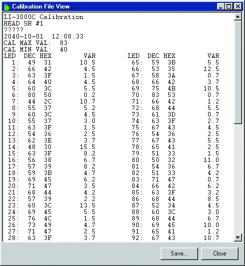 The Print Cal function outputs the calibration file (via the RS-232 or USB port) to the LI-3000C Application Software. The file is displayed in a Calibration File View window. The file can then be saved from this window.