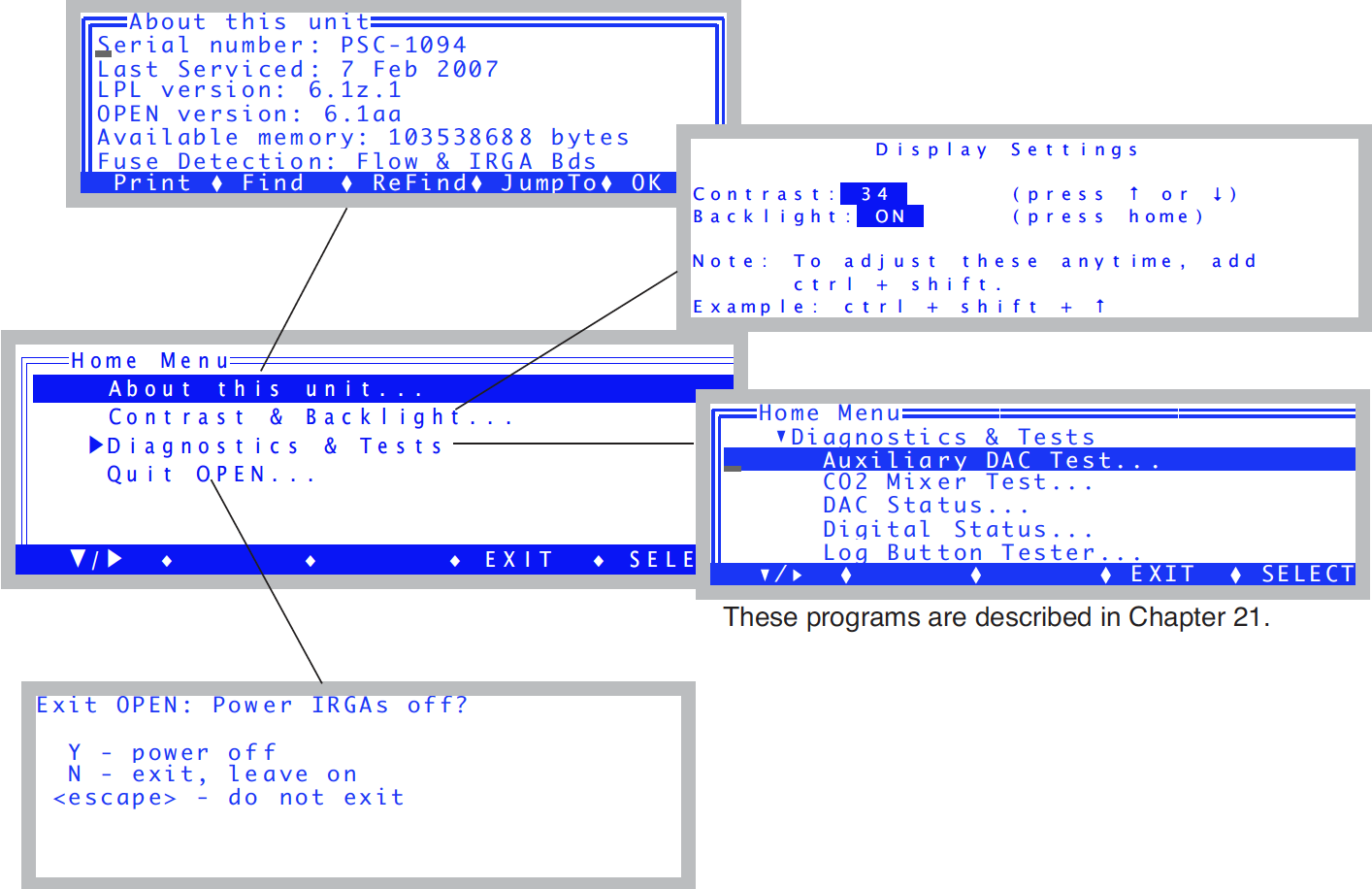 - The bottom entry in the Home Menu will ask if you wish to terminate OPEN. If you press Y, the program will turn off the flow control board and the analyzer board. If you press N, the boards are left on. It is not necessary to do either of these when turning off the instrument: you can just press the power switch while in OPEN’s main screen.
