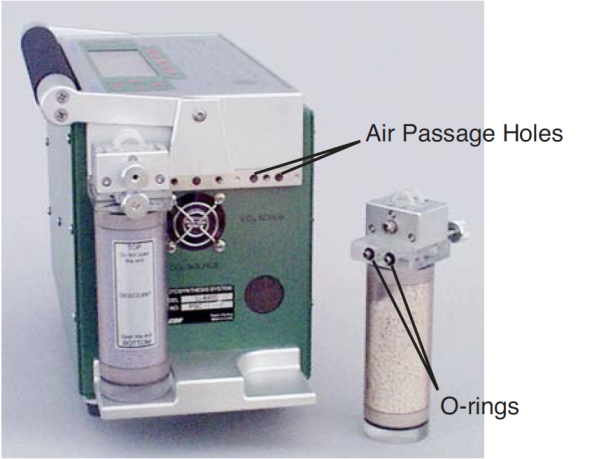 It is important that the threads be kept very clean. If dust or other debris accumulates on them, you will have a difficult time putting the end cap on far enough to compress the O-ring, and the tube will leak. This is most often a problem with the desiccant tube, and can show up as instability in the CO2 concentration in both reference and sample cells.