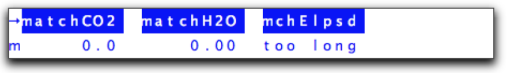In New Measurements mode, you can find out how long it has been since the last match, or what conditions were for the last match from display line ’m’ (Figure 4-8). matchCO2 is the reference CO2 reading at the previous match, matchH2O is the reference H2O reading at the previous match, and mchElpsd is the elapsed time (HH:MM:SS) since the previous match.