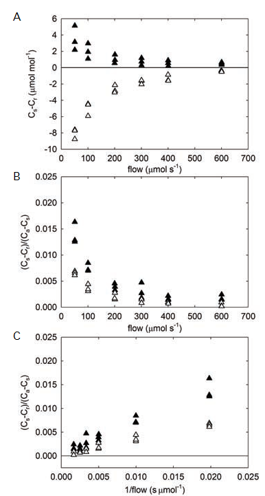 All photosynthetic systems that use chambers to enclose leaves develop CO2 gradients between the air inside the chamber and the ambient air. Diffusion along these concentration gradients alters the apparent measured leaf flux and can cause a substantial error in the measurement when the fluxes are low.