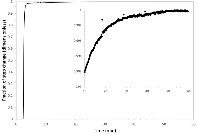 The response of the equilibrator to a change in water vapor concentration is not instantaneous. It takes on the order of minutes to reach steady state after the water vapor concentration is changed. Noting this will be important in the context of starting measurements, particularly if the chamber has been unused for a long period of time, and when a change is made to the reference water vapor concentration setpoint.