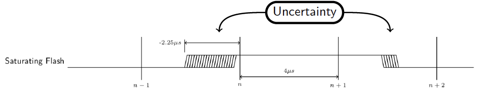 To relate Figure 8‑69 to when custom flash steps start and stop, note the following: a step's beginning or ending does not correspond to the vertical n lines. Rather, steps start and stop at times that correspond to the rising edge of the modulation pulse. Also, step duration times (if non-zero) are not allowed to be shorter than the modulation period, guaranteeing one data point.