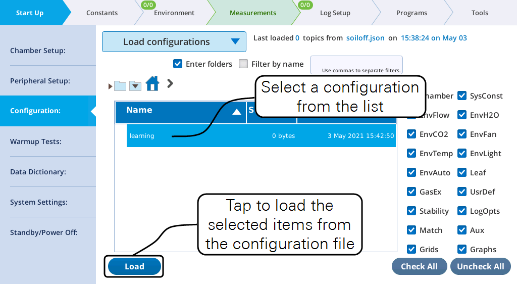 Here, you can load an existing configuration file. If there are no saved configurations, the list will be empty. To load a configuration, select the file and tap Load. If there are parameters that you do not want loaded, clear the check box, then tap Load.