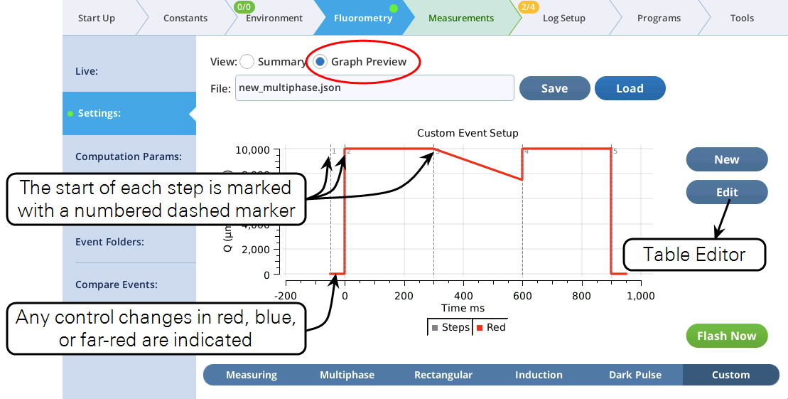 LI-6800 Software version 2.1 (and fluorometer/head firmware version 1.4.21 and higher) supports a user-defined custom flash. With this new feature, you can define up to 38 steps to be executed during a flash, and in each step specify duration, modulation rate, output rate, intensities of red, blue far red, modulation beam peak intensity, and rate of change of red actinic intensity. (We’ve called this a “flash”, but more generally this is an event, since it could be a dark pulse, or flash and a dark pulse, or anything you’d care to define.)