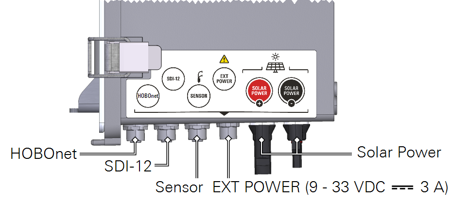 - Auxiliary Power Input: For operation from an external power supply (other than the solar panel or battery). Supports 9 to 33 VDC, 3.0 A maximum current. Be sure the power supply is stable. Unstable power may result in damage if power is lost while data are being written.
