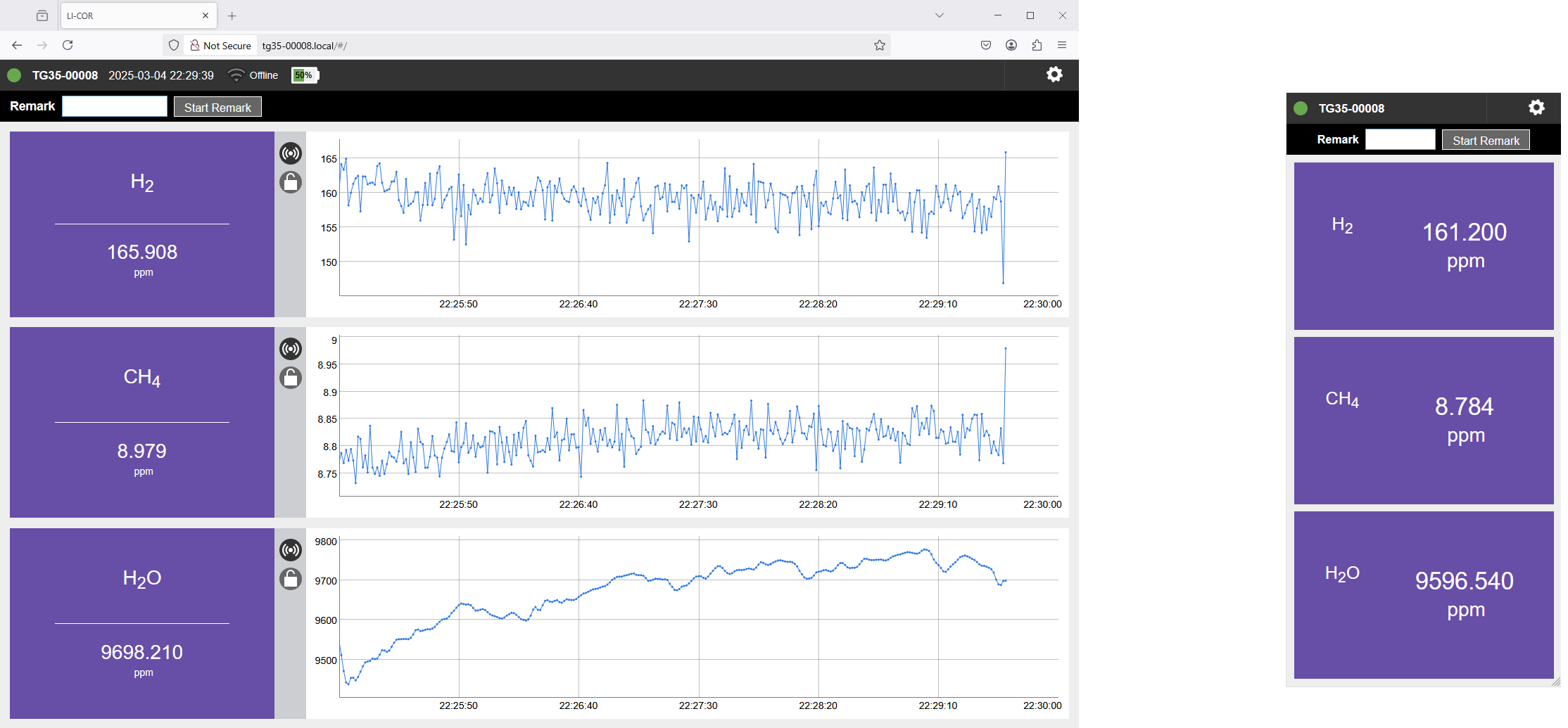 In the graphs, you can click and drag to zoom in and reset the zoom by double-clicking the graph. For any gas, you can click the rectangular panel to view more details, including the current measurement, mean, standard deviation, and slope for the displayed time range. You can adjust the plotted time range with a slider or by typing in the number of seconds in Graph Range (Seconds). Click Reset to restore the default range of 300 seconds.