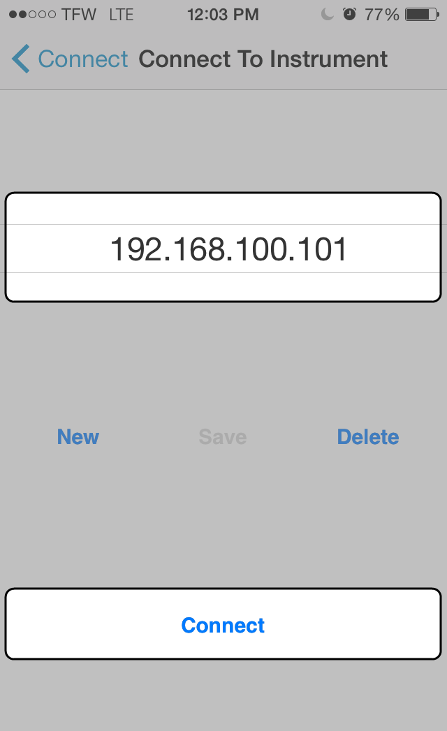 If your mobile device is set to automatically join the network, all you need to do to connect is select the instrument IP address and tap Connect in the future.