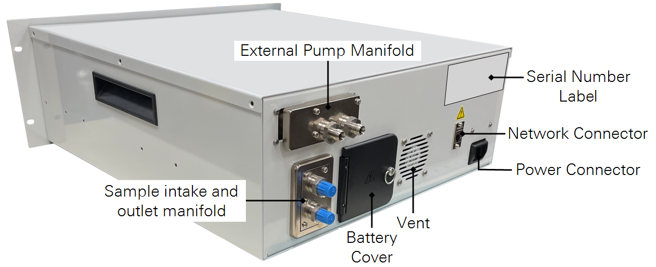 The gas analyzer is in a gray enclosure. It is designed for indoor use in an instrument rack. One analyzer occupies four rack units (4U). The gas analyzer can be operated with the built-in pump or an optional external pump.