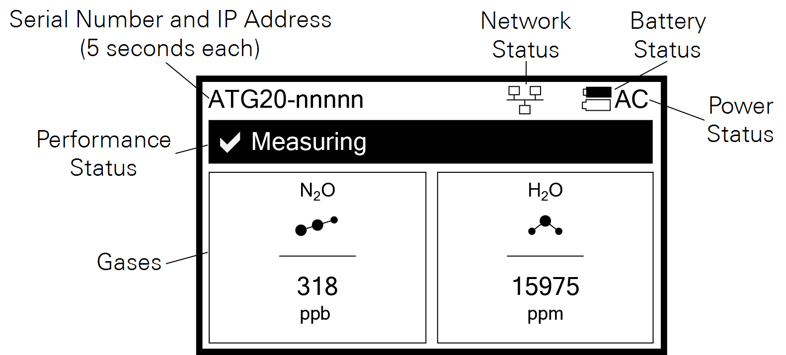 - Serial Number and IP Address: The instrument serial number (hostname) and network-assigned IP address (IPv4) rotate for 5 seconds each. The serial number is also printed on the case label.